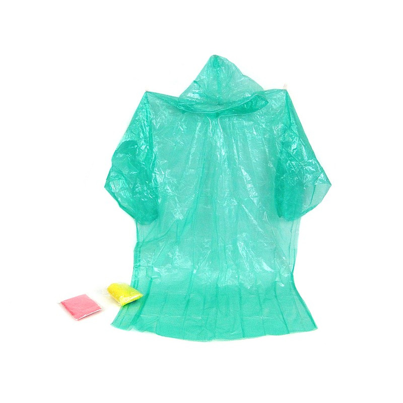 Õhukesest kilest vihmakeep täiskasvanutele, kapuutsiga, kummipaelad varrukatel ja kapuutsil, mõõdud 120x80cm.