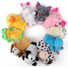 Komplektis 10 värvilist loomakujulist nukku: jõehobu, elevant, väike jänku, part, lehm, koer, panda, karu, hiir, konn.