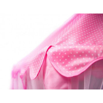 Roosa kuusnurga kujuline lastetelk. Kaunistatud volangidega ja valge võrguga - kardin, mis toimib sääsevõrguna. Polüester materjalist kuusnurkne telk mõõtudega 1,35x1,35x1,40 meetrit.
